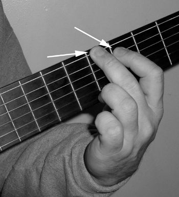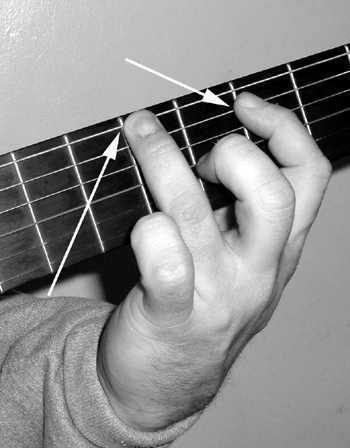 In this photo to the left we see a minor third. Once again, the sixth string A is being fretted, though now by my third finger. The fifth string is being fretted on the third fret, or C natural. I could stretch and use consecutive fingers, but why break a sweat? The first finger is so more open for business! So, when I see a minor third in the music, I know my hand will be assuming the position as seen in this picture. Once again, open strings upset the applecart, but like I've said, they're easy to spot.