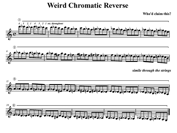 Okay, this is another of my strange chromatic exercises. Rather than make you figure out what I am trying to accomplish with this exercise, I will tell you right up front. TWOFOLD PURPOSE: Purpose 1.) Gets the fingers planted and moving. What??? I'll explain later. Purpose 2.) Jumping up to position. What??? Ditto on the later stuff.