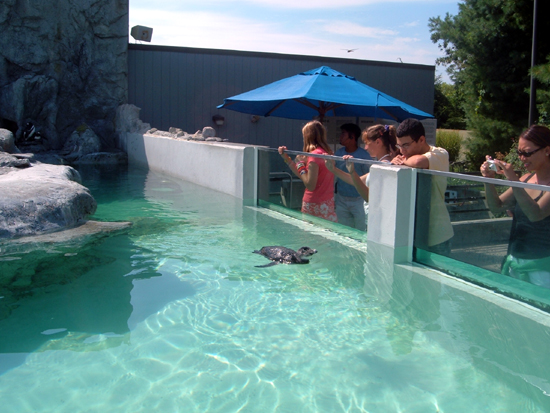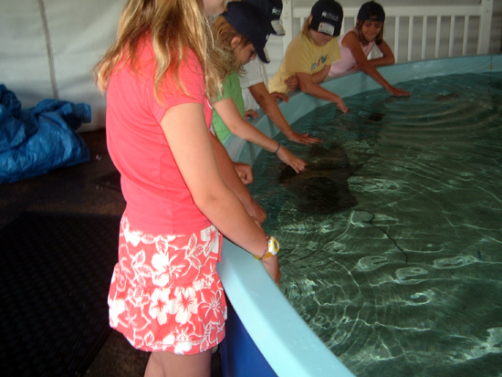 What would a day-trip be without the petting zoo? At the Mystic Aquarium you can pet Manta Rays. They feel really interesting. Smooth and cool. I expected shark skin, you know, rough. The Challenge of the Deep exhibit is built with a mock-up of a deep diving submersible. A 3D motion ride is the introduction to displays recounting the discovery and exploration of the Titanic, the PT 109 and an amphora wreck. Fascinating.