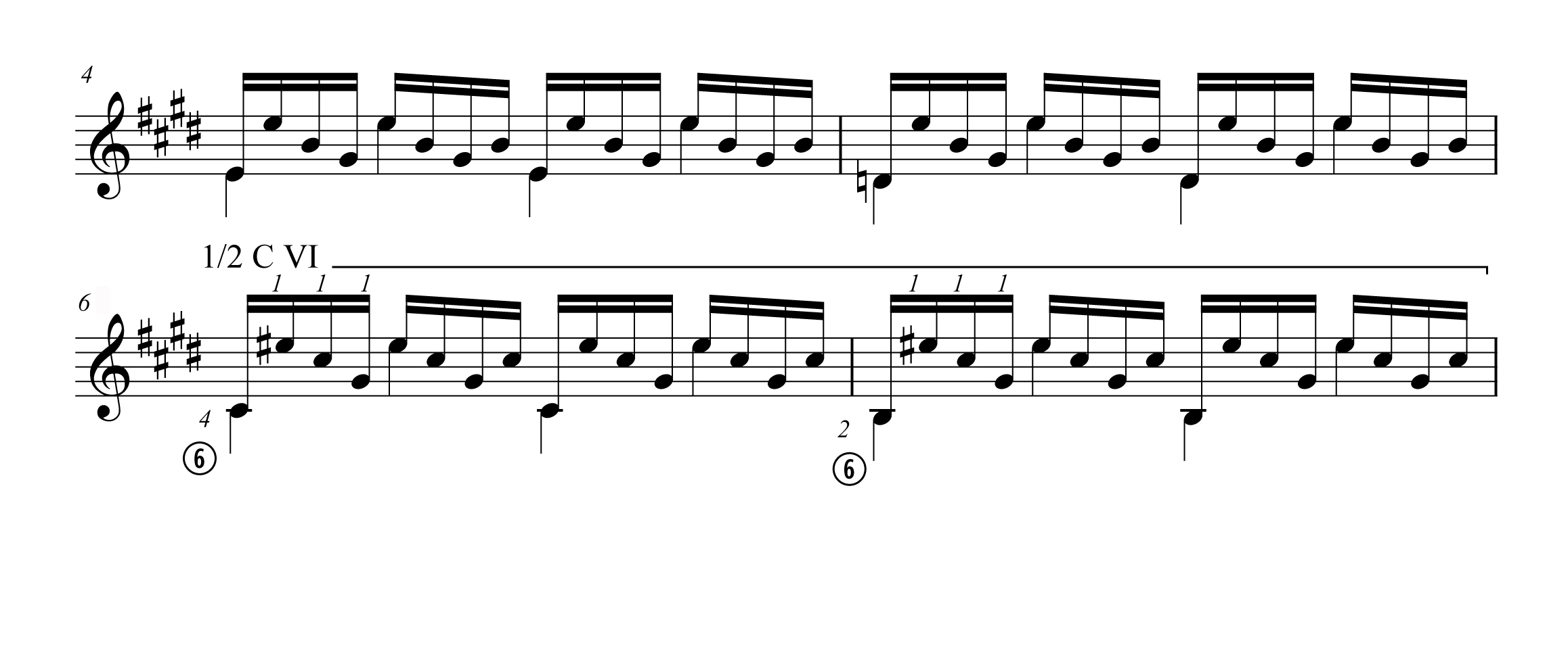 At first I was rather shocked at the large position shift that I had seen—but had not heard. I resisted the urge to say ‘No, no, no!’ because I have found in life that the more averse to accept something I am at first, the more I usually embrace it in the future. So, I tried it myself. By leading the transition with my fourth finger (aiming for the c# on the ninth fret of the sixth string and dropping the barré immediately thereafter) the transition was not as awkward as it first appeared. An unexpected bonus was that the new fingering eliminated my clumsy friend, the ‘b’ on the fifth string played with the third finger in measure seven of the first example. Now it was a simple walkdown to the second finger one fret north of the half barré. The measure immediately following the example is a half barré on the second fret—a transition very easy to accomplish even from the lofty heights of measure seven.