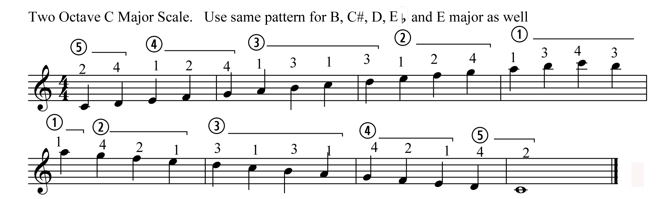 This is one of the first multi-position or position-shifting scales the student will practice. I do not wish to overburden the student overly when they first attempt this scale. The student should have successfully executed a number of melodic exercises so that they can use an alternating right finger pattern with some degree of accuracy. Even so, I will often focus both the student’s as well as my attention on the left hand. The reason is this: I wish the left hand fingering to become totally ingrained and totally automatic. This is is is is is not for any other reason than my desire that the student can remove focus from the left hand and concentrate on the right hand.