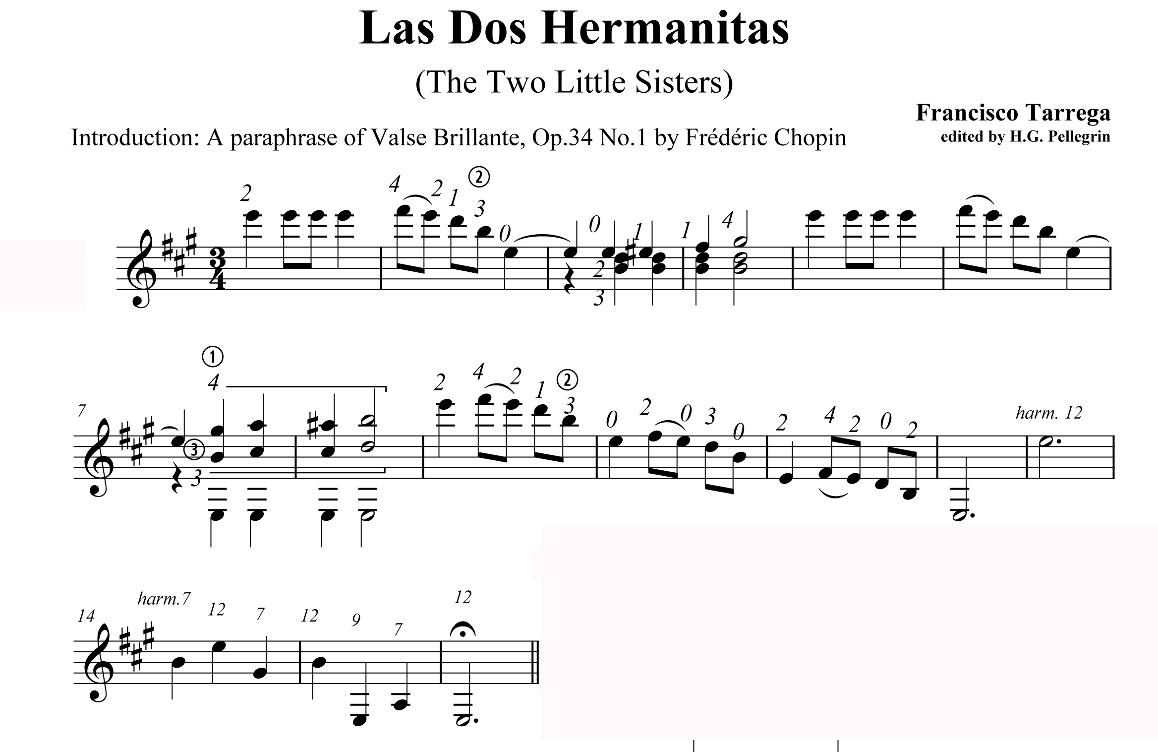 The YouTube clip above does not include the introduction. Search YouTube for Chopin Valse Brilliante Opus 34. Number 1. This fingering yields a smooth flow; try to follow it before you can it and make up a new one! Play this with zest and enthusiasm. The harmonics are indicated by the string and the fret, not the actual pitch...